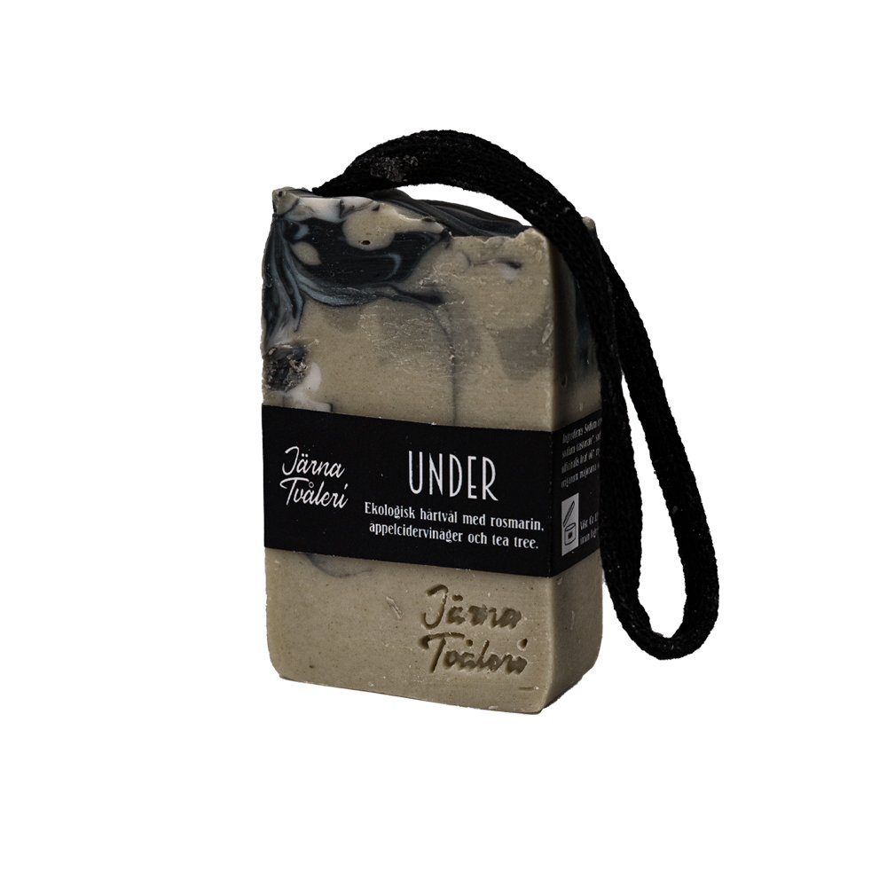 Under är en ekologisk hårtvål för balanserad hårbotten med svart bomullssnöre för upphängning. Med lugnande, antiseptiska och välgörande ingredienser som äppelcidervinäger, grön lera, rosmarin och tea tree, är denna hårtvål komponerad för att verka balanserande för hårbotten. Doften är fräsch och örtig. Tea tree har en bakterie- och svampdödande effekt. Rosmarin ökar cirkulationen i hårbotten, gynnar hårtillväxt och verkar svampdödande. Grön lera sänker tvålens PH lite, samtidigt som den drar till sig fett och balanserar hårbotten. Hårtvålens färger kommer från grön lera, salt och aktivt kol.